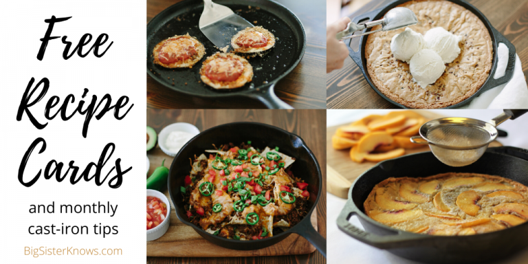 Want four free, printable recipe cards featuring your favorite cast-iron pan? Sign up for my newsletter today to download your recipe cards and get a monthly email from me with exclusive tips for using your cast-iron skillet or Dutch oven.