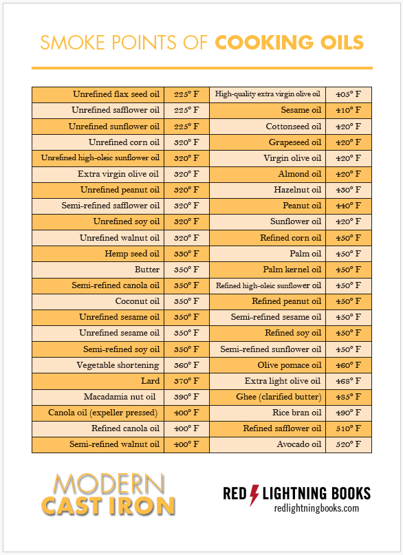 To identify the smoke point of an oil, you can check the back label. Some oils will indicate whether they can be eaten directly on salads (not heated at all) or used for high-heat cooking. However, to determine the exact smoke point, you may need to do a quick internet search. OR you can reference this handy chart from my book, Modern Cast Iron. This chart includes common (and some not-so-common) oils, in order of their smoke points. (Click to download a printable version.)