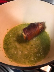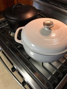 Add broth, bay leaf, and peas to the pot. Bring to a boil, then place the lid on the Dutch oven and reduce the heat. Simmer for 45-60 minutes, or until peas are tender.